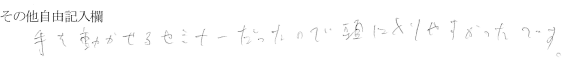 セミナーの内容がお役に立てたようで、嬉しいです! 自己流でエクセルを使っていると、業務で何とかなっているようでいて、実は効率が良くない方法を使ってしまっていることも多くあります。今回のセミナーのように、短時間で集中的に重要なポイントを学んでいただくことで、その後のお仕事がとても楽になり、効率化すると思います。ぜひお仕事で使ってみながら復習をしていただければと思います。またのご参加をお待ちしております。ありがとうございました。