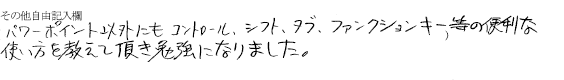 この度はパワーポイント初級セミナーへのご参加をありがとうございました。パワーポイントには、普通に使っているだけでは気づかないような便利な機能も多くありますので、このようなセミナーで体系的に学んでいただくことで、お仕事も大幅に効率化するのではないかと思っています。ぜひ今回の内容を業務の中で使いながら復習し、ご自身のものとして習得いただければと思います。今後ともどうぞよろしくお願いいたします。