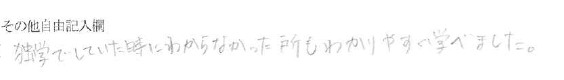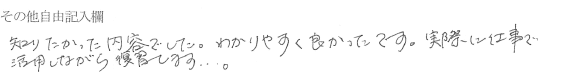 セミナーご受講お疲れ様でございました。質問しやすかったとのお話、嬉しく思います。今回のセミナーで習得されたことを是非お仕事でもご活用いただけたらと思います。実際に「使ってみる」ことが一番の復習ですし、「知識を自らのものとする」ための近道ですので。それでは、今後ともどうぞよろしくお願いいたします。