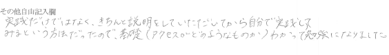 この度はアクセス初級セミナーへのご参加をありがとうございました。また、お褒めの言葉をいただきまして、とても嬉しく思います。アクセスは最初は難しい印象がどうしてもあると思いますが、今回のセミナーの様に順序立てて学習すればお仕事に使えそうなイメージをつかんでいただけるのではないかと思います。ぜひ復習をし、次のステップの学習に繋げていただければと思います。今後ともどうぞよろしくお願いいたします。